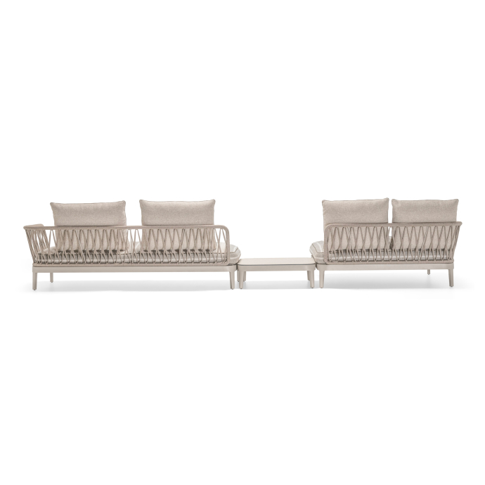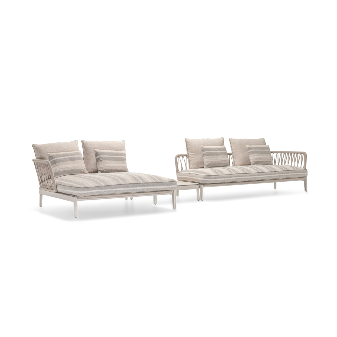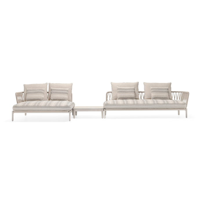 A refined evolution of the original indoor concept, the Chelsea Modular Outdoor sofa reinterprets its distinctive identity for open‑air living while preserving the collection’s formal coherence. Developed by Studio Dordoni, the outdoor version translates the architectural clarity of the indoor system into a structure engineered for durability, comfort, and visual elegance.