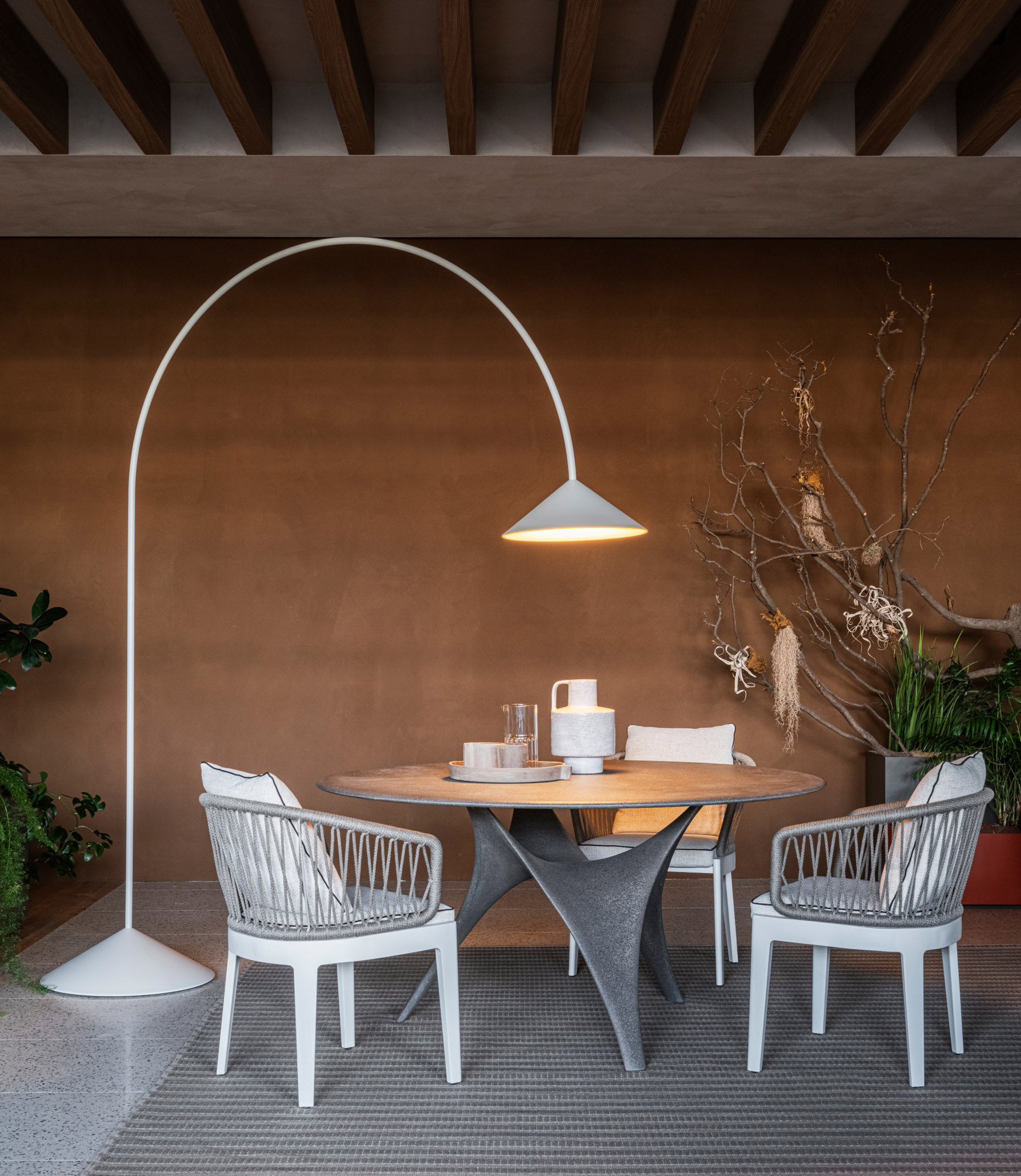 Out by Vibia X Molteni&C introduces a refined and understated approach to outdoor lighting, reshaping the relationship between object, illumination, and the surrounding environment. Conceived to cast a downward, gently diffused light, it generates subtle gradients across surfaces, bringing depth and texture to terraces, gardens, and open‑air seating areas.