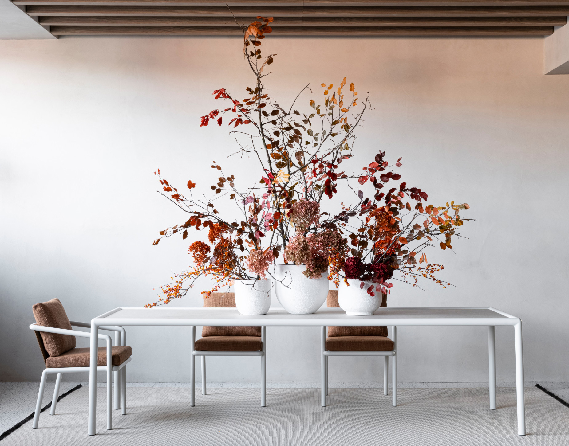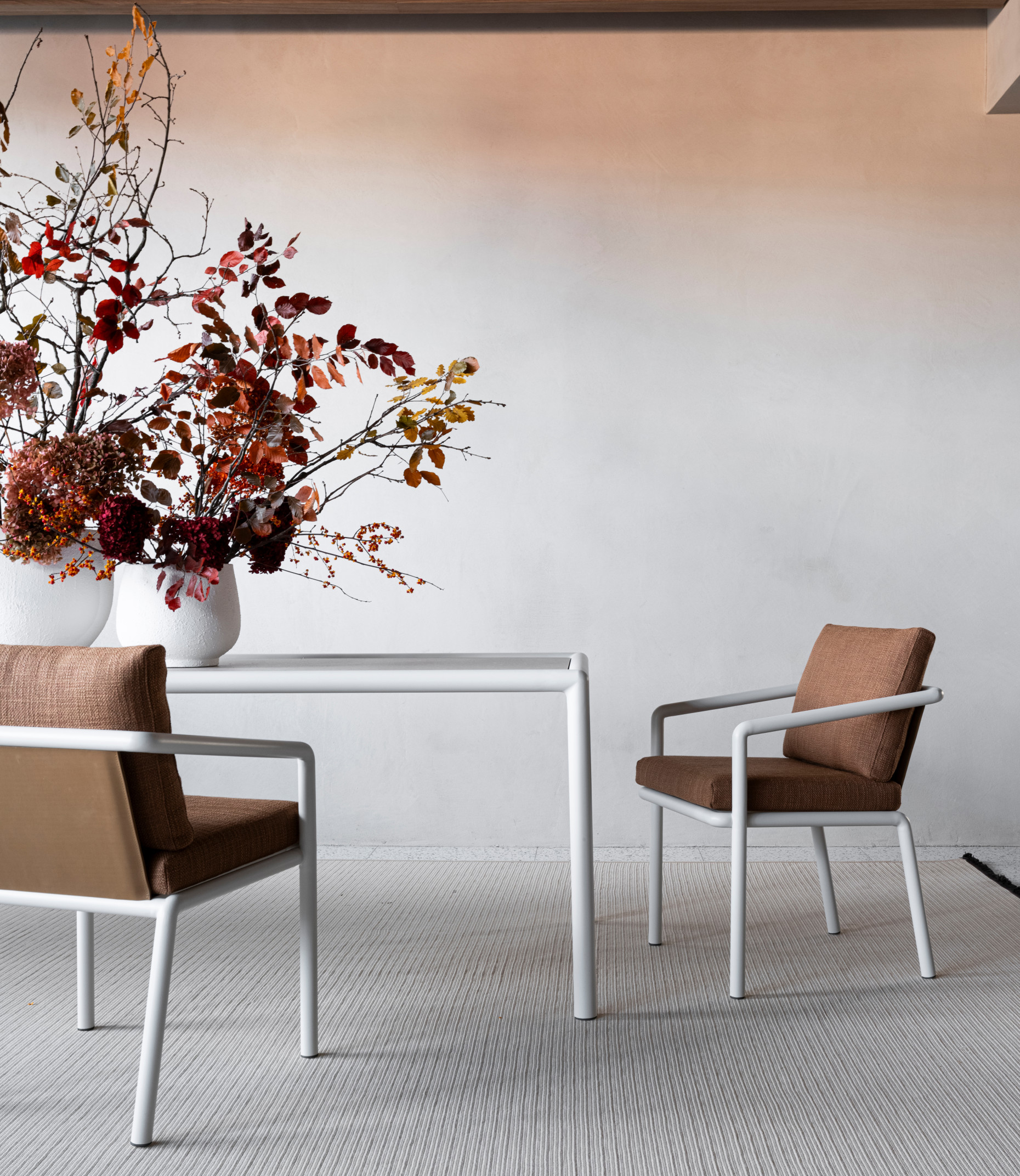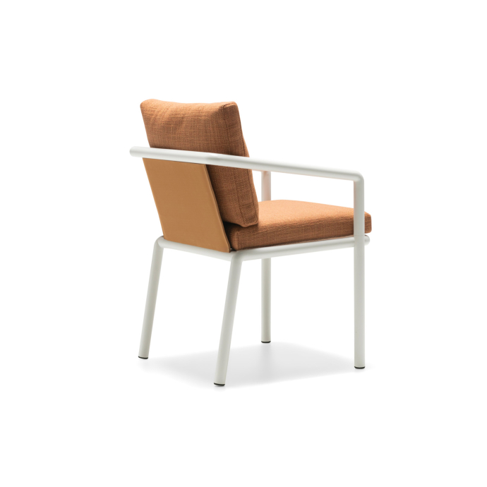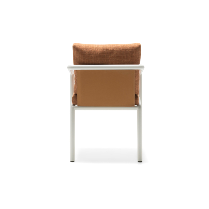 With its measured proportions and timeless elegance, the Soleva chair by Vincent Van Duysen translates the architectural clarity of the Soleva family in an upright posture, offering the support and composure needed for shared meals, long conversations, and leisurely gatherings in the open air. Its powder‑coated tubular aluminum structure outlines a light yet sturdy profile that integrates seamlessly into diverse outdoor settings.
